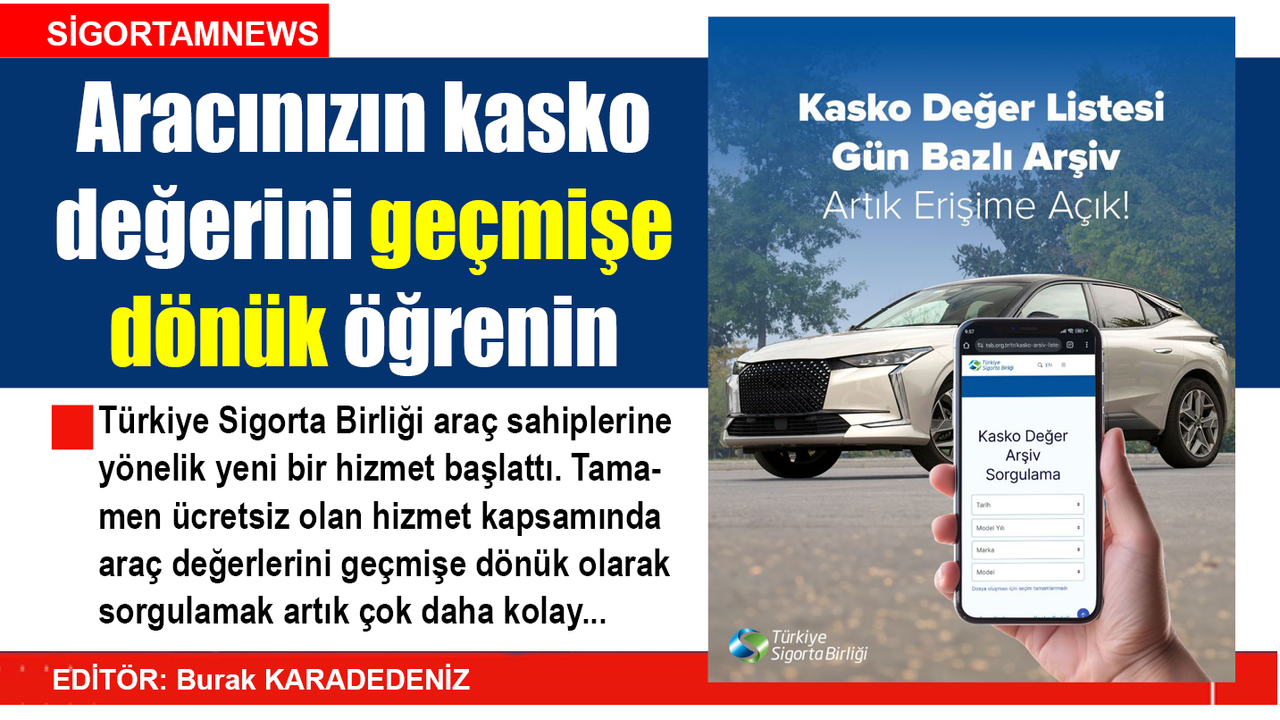 Türkiye Sigorta Birliği (TSB) tarafından yürütülen çalışmalar sonucunda, Kasko Değer Listesi’nin gün bazlı arşiv uygulaması hayata geçirildi. Uygulama ile sadece belirli bir ayın son listesini değil, geçmişteki herhangi bir güne ait kasko değerini görüntülenebiliyor.