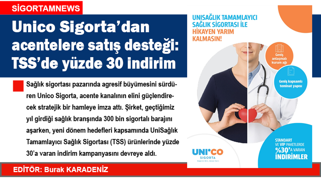 Sağlık sigortası pazarında agresif büyümesini sürdüren Unico Sigorta, acente kanalının elini güçlendirecek stratejik bir hamleye imza attı. Şirket, geçtiğimiz yıl girdiği sağlık branşında 300 bin sigortalı barajını aşarken, yeni dönem hedefleri kapsamında UniSağlık Tamamlayıcı Sağlık Sigortası (TSS) ürünlerinde yüzde 30’a varan indirim kampanyasını devreye aldı.